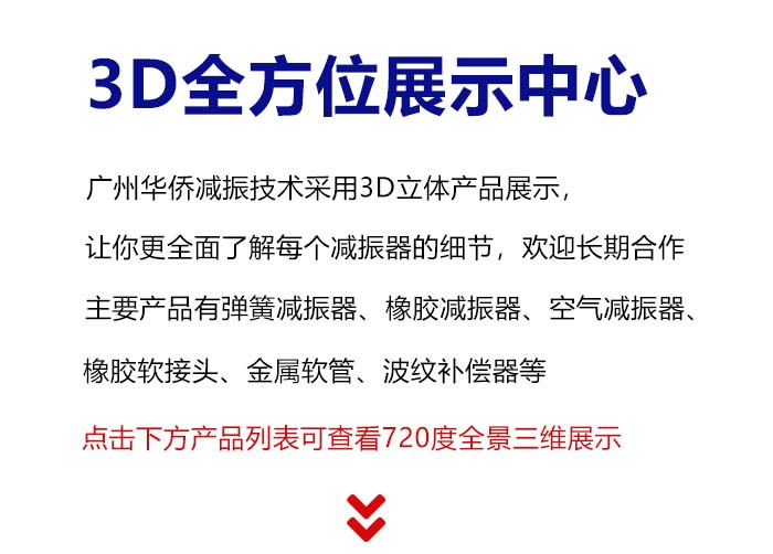 廣州華僑減振技術有限公司主要產(chǎn)品有彈簧減振器、橡膠減振器、空氣減振器、橡膠軟接頭、金屬軟管、波紋補償器等,其產(chǎn)品適用于水泵、風機、冷水機組、柴油機、冷卻塔、變壓器、風力發(fā)電等設備的基礎減振以及各類風機盤管,新風機組、風管等吊裝減振。波紋管產(chǎn)品及橡膠軟接頭通用于自來水、電力、鋼鐵、石油、化工、造紙、印刷等行業(yè)。